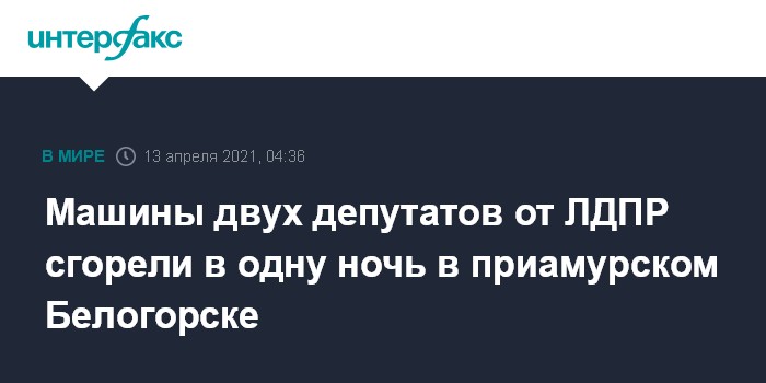 Москва. 13 апреля. INTERFAX.RU - Автомобиль руководителя фракции ЛДПР в Белогорском городском Совете народных депутатов (Амурская область) Натальи Михайловой и ее коллеги по партии сгорели в ночь на вторник.