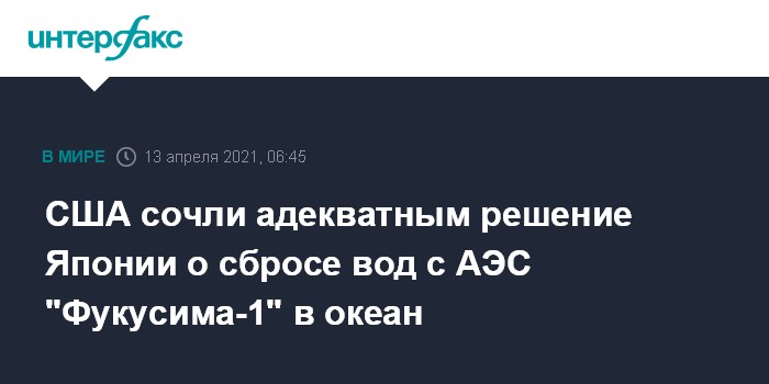 Москва. 13 апреля. INTERFAX.RU - США рассчитывают, что Япония ответственно подошла к вопросу утилизации воды, которая использовалась для охлаждения реакторов АЭС "Фукусима-1", пострадавшей от цунами в 2011 году, и надеются на дальнейшую координацию по этому вопросу с правительством в Токио, говорится в сообщении американского Госдепа.