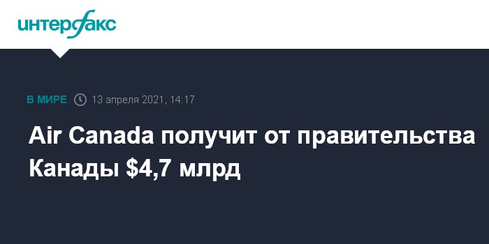 Москва. 13 апреля. INTERFAX.RU - Правительство Канады согласилось выделить авиакомпании Air Canada до 5,879 млрд канадских долларов ($4,7 млрд) госпомощи, сообщила пресс-служба перевозчика.