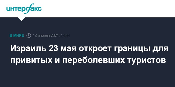 Москва. 13 апреля. INTERFAX.RU - Израиль 23 мая откроет границы для туристов, имеющих антитела после болезни или прививку от коронавируса. Об этом сообщает во вторник департамент России и СНГ министерства туризма страны.
