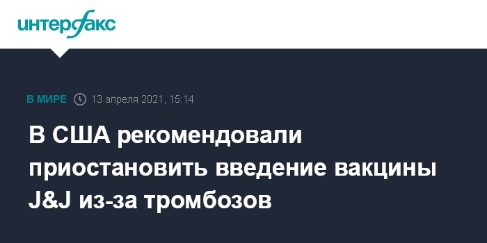 Москва. 13 апреля. INTERFAX.RU - Управление по контролю за продуктами и лекарствами США (FDA) рекомендовало приостановить использование вакцины против коронавируса COVID-19 производства компании Johnson & Johnson из-за случаев тромбоза.