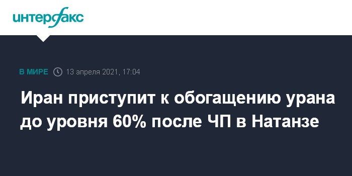 Москва. 13 апреля. INTERFAX.RU - Иран, начиная со среды, 14 апреля, приступает к обогащению урана до уровня 60%, сообщают иранские и западные СМИ со ссылкой на заявление замглавы МИД страны Аббаса Аракчи.