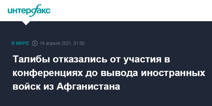 Москва. 14 апреля. INTERFAX.RU - Движение "Талибан" (запрещено в РФ) объявило, что не будет принимать участие в международных конференциях до тех пор, пока из Афганистана не будут выведены все иностранные военные.