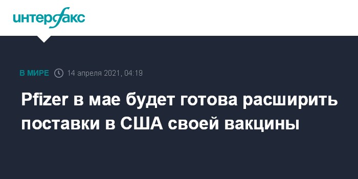 Москва. 14 апреля. INTERFAX.RU - К концу мая текущего года по мере расширения производства компания Pfizer может на 10% увеличить поставки своей вакцины от коронавируса в Соединенные Штаты, написал исполнительный директор компании Альберт Бурла в своем твиттере во вторник.