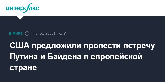 Москва. 14 апреля. INTERFAX.RU - США предложили провести встречу президентов Владимира Путина и Джо Байдена в одной из европейских стран, сообщил пресс-секретарь главы российского государства Дмитрий Песков.