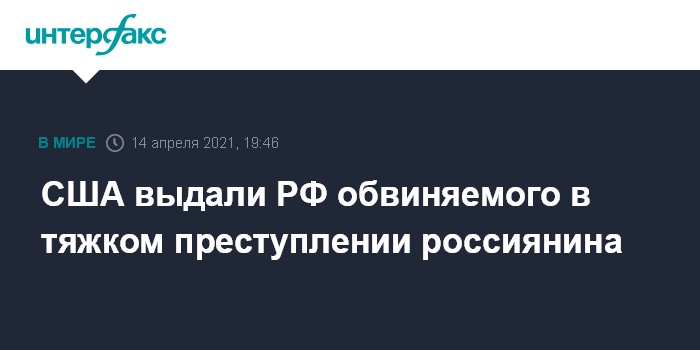 Москва. 14 апреля. INTERFAX.RU - Из США в РФ экстрадирован россиянин, обвиняемый в совершении тяжкого преступления на территории Ханты-Мансийского автономного округа.