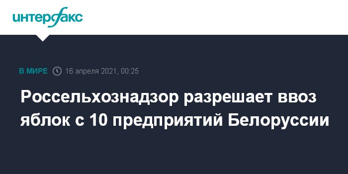 Москва. 16 апреля. INTERFAX.RU - Россельхознадзор разрешает ввоз яблок с 10 предприятий Брестской области Белоруссии.