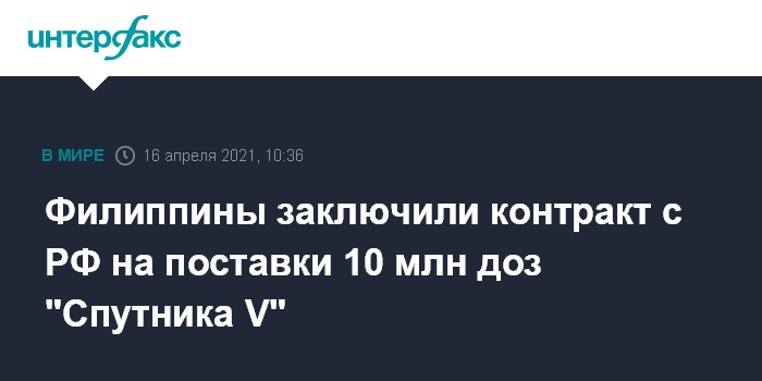 "Филиппинское правительство подписало соглашение о поставках 10 млн доз вакцины "Спутник V" от Национального исследовательского центра эпидемиологии и микробиологии имени Гамалеи, сказал Гальвес", - передает агентство.