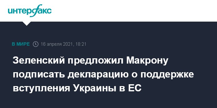 Москва. 16 апреля. INTERFAX.RU - Президент Украины Владимир Зеленский предложил французскому президенту Эммануэлю Макрону подписать декларацию о поддержке вступления Украины в Европейский Союз.