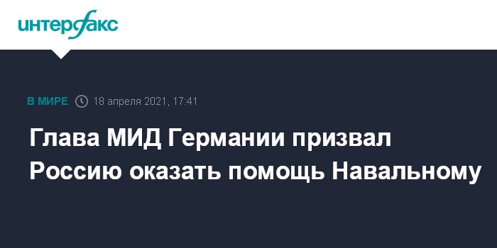 Москва. 18 апреля. INTERFAX.RU - Глава МИД ФРГ Хайко Маас призывает Россию оказать немедленную "адекватную медицинскую помощь" оппозиционеру Алексею Навальному.