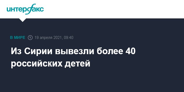 Москва. 19 апреля. INTERFAX.RU - Из Сирии возвращены 44 российских ребенка, сообщила детский омбудсмен Анна Кузнецова.