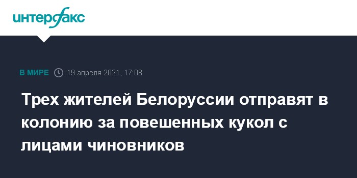 Москва. 19 апреля. INTERFAX.RU - Три жителя белорусского Могилева получили от 3 до 3,5 лет колонии за повешение кукол с лицами чиновников, сообщили в понедельник в незарегистрированном в Белоруссии правозащитном центре "Весна".