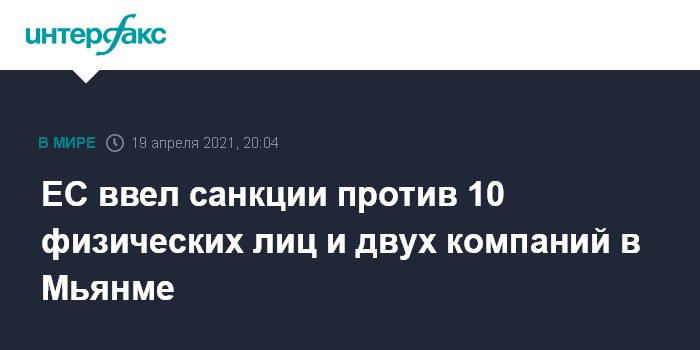 Москва. 19 апреля. INTERFAX.RU - Европейский союз ввел в понедельник санкции в отношении десяти граждан Мьянмы и двух контролируемых военными компаний в связи с февральским военным переворотом и последующими репрессиями.