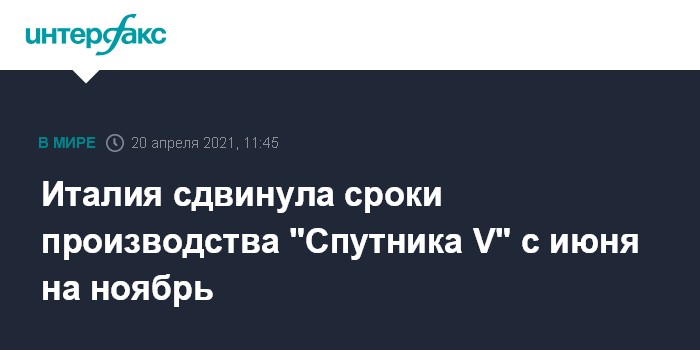 "Уже подписан контракт на передачу технологий, завершается работа над контрактом по производству. Визит делегации Европейского медицинского агентства (ЕМА) дал позитивные результаты. Если все будет хорошо и до конца мая ЕМА даст положительное заключение, то тогда можно будет переходить к практической работе. В начале ноября – в худшем случае конце ноября – можно будет говорить о производстве "Спутника V" для Италии", - сказал Фаллико.
