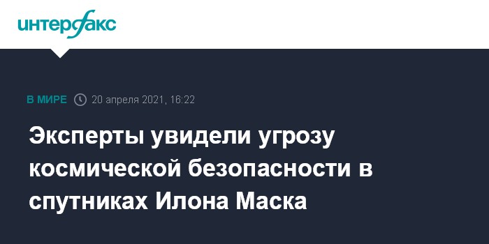 Москва. 20 апреля. INTERFAX.RU - Проект SpaceX Илона Маска по запуску на орбиту интернет-спутников Starlink угрожает безопасности космоса и окружающей среды, считают конкуренты компании и эксперты. Об этом пишет The Wall Street Journal.