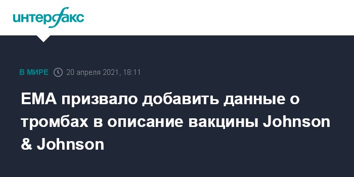Москва. 20 апреля. INTERFAX.RU - Европейское агентство лекарственных средств (ЕМА) рекомендовало добавить предупреждение о возможном образовании тромбов к информации о вакцине против коронавируса Janssen, принадлежащей корпорации Johnson & Johnson.