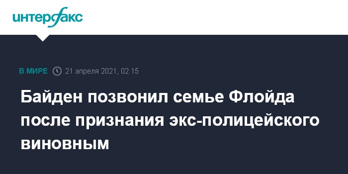 Москва. 21 апреля. INTERFAX.RU - Президент США Джо Байден и вице-президент Камала Харрис позвонили семье Джорджа Флойда после того, как присяжные признали бывшего полицейского Миннеаполиса Дерека Шовена виновным в его убийстве.