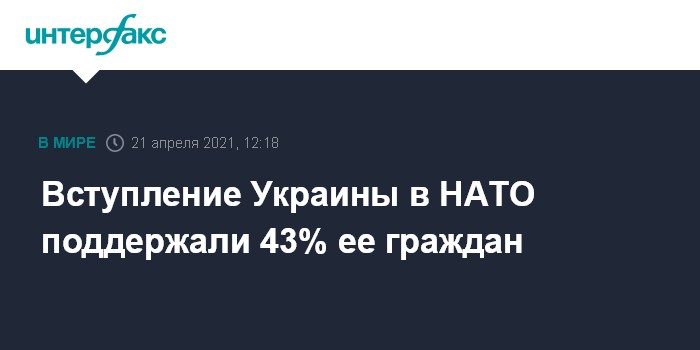 Москва. 21 апреля. INTERFAX.RU - 43% граждан Украины поддерживают идею вступления страны в НАТО. Об этом свидетельствуют данные социологического исследования об отношении украинского общества к эскалации конфликта в Донбассе. Опрос провел Украинский институт будущего (UIF) при содействии "Нью Имидж маркетинг групп".