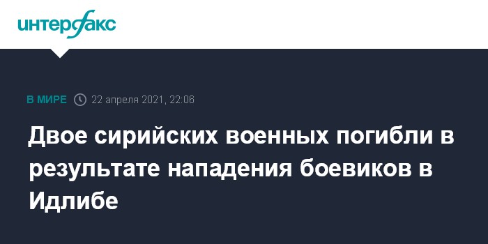 Москва. 22 апреля. INTERFAX.RU - В зоне деэскалации Идлиб боевики напали на позиции правительственной армии, двое сирийских военных погибли, один ранен, сообщил заместитель руководителя российского центра по примирению враждующих сторон в Сирии контр-адмирал Александр Карпов.