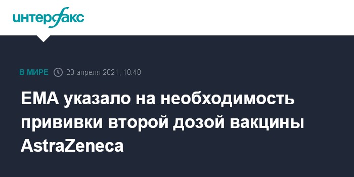 Москва. 23 апреля. INTERFAX.RU - Европейское агентство лекарственных средств (ЕМА) заявило о необходимости прививаться второй дозой вакцины AstraZeneca, несмотря на риск тромбоза. Об этом сообщает Associated press.