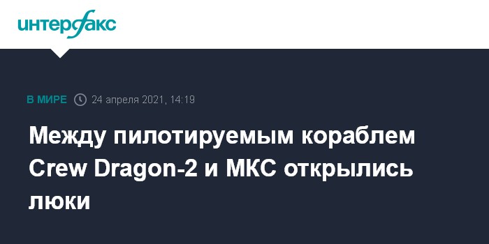 Москва. 24 апреля. INTERFAX.RU - Между американским пилотируемым кораблем Crew Dragon-2 компании SpaceX и Международной космической станцией (МКС), к которой он пристыковался в субботу, открылись люки, сообщило НАСА.