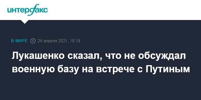 Москва. 24 апреля. INTERFAX.RU - Президент Белоруссии Александр Лукашенко заявил, что не обсуждал на переговорах в Москве с президентом РФ Владимиром Путиным размещение российских военных баз на территории республики, сообщает пресс-служба главы Белоруссии в субботу.