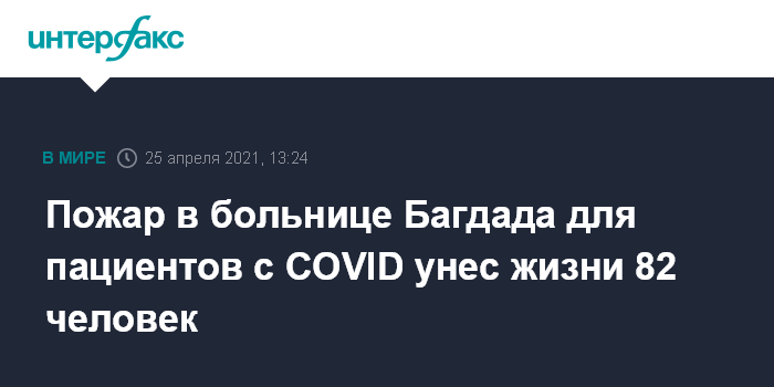 Москва. 25 апреля. INTERFAX.RU - Министерство внутренних дел Ирака проинформировало в воскресенье, что жертвами пожара в багдадской больнице для COVID-пациентов стали 82 человека, сообщает Associated Press.