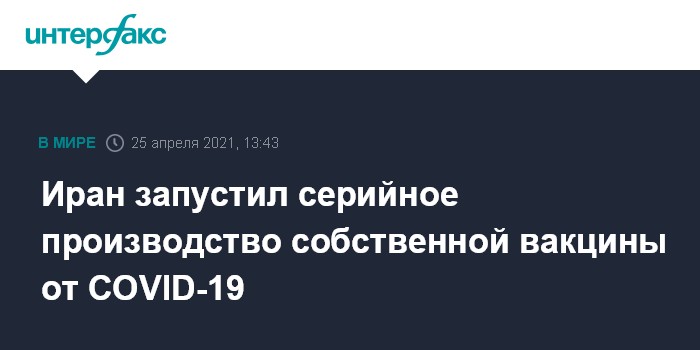 Москва. 25 апреля. INTERFAX.RU - В Иране началось серийное производство собственной вакцины от COVID-19 COVIRAN, сообщает в воскресенье Анатолийское агентство новостей.