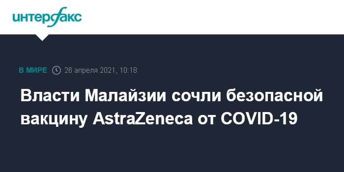 Москва. 26 апреля. INTERFAX.RU - Органы здравоохранения Малайзии полагают, что вакцина AstraZeneca от коронавируса COVID-19, первая партия которой недавно поступила в страну, является безопасной. Об этом сообщает в понедельник сингапурский телеканал Channel NewsAsia.