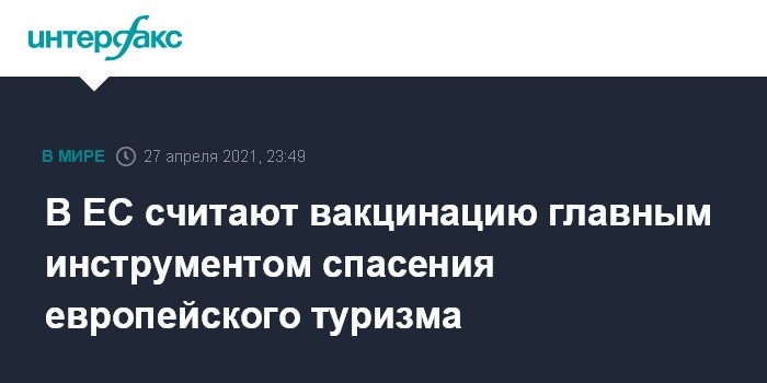 Москва. 27 апреля. INTERFAX.RU - Спасение и восстановление туристического сектора стран ЕС в условиях продолжающейся пандемии - задача ясная, но сложная, заявил член Еврокомиссии (ЕК) по внутреннему рынку Евросоюза Тьерри Бретон.