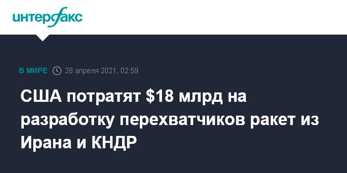 Москва. 28 апреля. INTERFAX.RU - Пентагон планирует потратить почти $18 млрд на разработку, производство и поддержку перехватчиков ракет из Северной Кореи или Ирана, что является первой крупной оборонной госзакупкой администрации президента Джо Байдена, сообщает агентство Bloomberg.