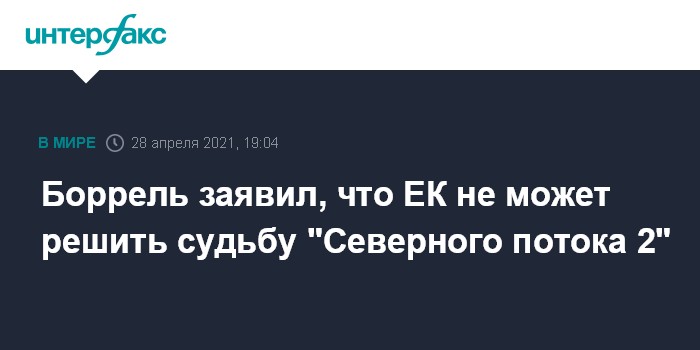 Москва. 28 апреля. INTERFAX.RU - Европейская комиссия не имеет возможности принимать решения о судьбе проекта газопровода "Северный поток 2", заявил в среду глава европейской дипломатии Жозеп Боррель.