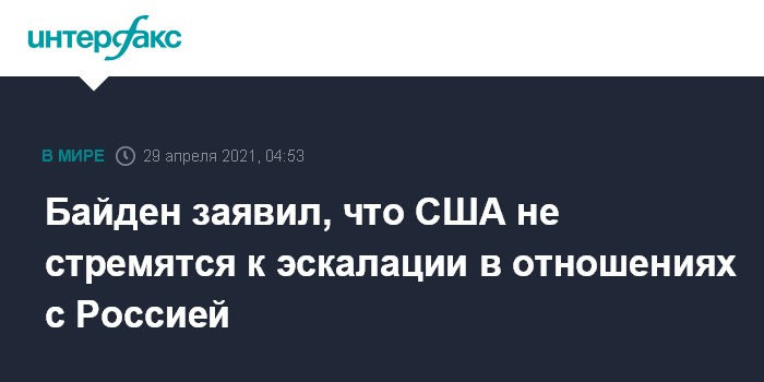 Москва. 29 апреля. INTERFAX.RU - Президент США Джо Байден в своем обращении к Конгрессу заявил, что не настроен на эскалацию в отношениях с Россией, и выразил готовность к сотрудничеству.