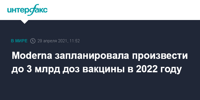 Москва. 29 апреля. INTERFAX.RU - Американская компания Moderna объявила, что она намерена в 2022 году увеличить производство вакцин от коронавируса до 3 млрд доз. Об этом говорится в заявлении генерального директора корпорации Стефана Банселя.