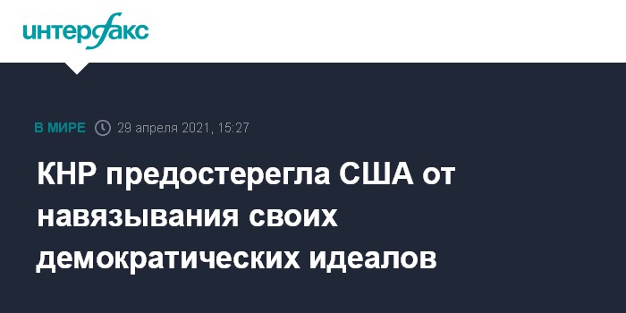 Москва. 29 апреля. INTERFAX.RU - МИД Китая призвал Вашингтон не навязывать свои демократические идеалы. По сообщениям западных СМИ, представитель китайского внешнеполитического ведомства Ван Вэньбинь предупредил, что "принуждение других стран принять чью-либо демократическую систему лишь вызовет раскол, усилит напряженность и подорвет стабильность".
