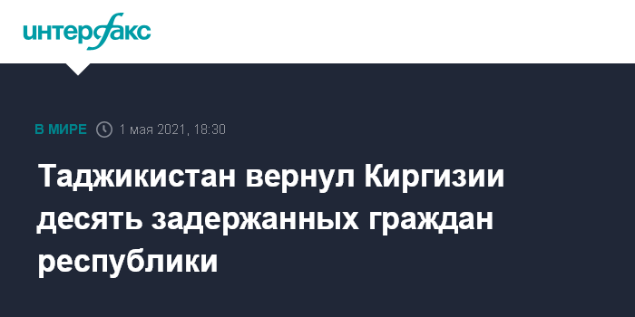 Москва. 1 мая. INTERFAX.RU - Власти Таджикистана вернули Киргизии десять граждан республики, задержанных во время вооруженного конфликта на границе, сообщили в субботу "Интерфаксу" в Баткенской областной администрации.