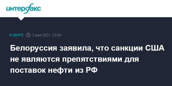 Москва. 2 мая. INTERFAX.RU - Нефть из РФ поставляется в Белоруссию в соответствии с контрактами, штатно, несмотря на санкции США, сообщил премьер-министр республики Роман Головченко.