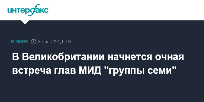 Москва. 3 мая. INTERFAX.RU - Встреча министров иностранных дел стран-участниц "группы семи" (G7) начнется 3 мая в очном формате в Лондоне при соблюдении строгих мер эпидемиологической безопасности в условиях пандемии COVID-19. Работа форума продлится до 5 мая.