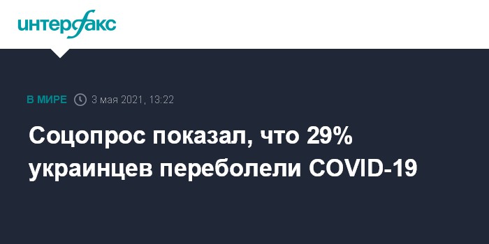 Москва. 3 мая. INTERFAX.RU - На Украине еще не болели коронавирусом 65% опрошенных граждан, а о том, что переболели, сообщили 29% в ходе всеукраинского опроса общественного мнения, проведенного Киевским международным институтом социологии (КМИС)