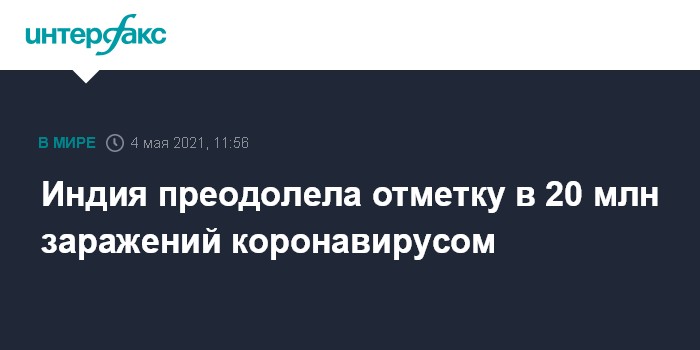 Москва. 4 мая. INTERFAX.RU - Число заражений коронавирусной инфекцией в Индии превысило 20 млн и достигло 20,28 млн случаев, согласно данным Университета Джонса Хопкинса.