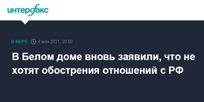 Москва. 4 мая. INTERFAX.RU - США не стремятся к эскалации отношений с Россией, заявила во вторник пресс-секретарь Белого дома Дженнифер Псаки, повторив позицию американской администрации по этой проблеме.