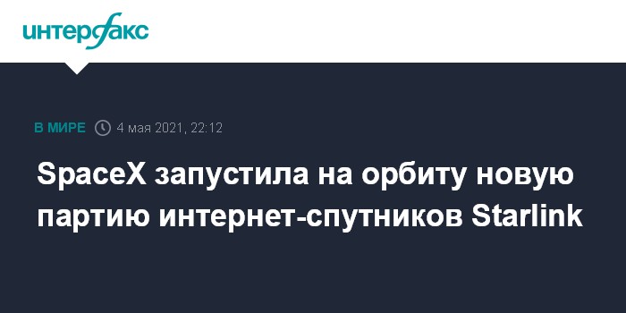 Москва. 4 мая. INTERFAX.RU - Ракета-носитель Falcon 9 во вторник стартовала на орбиту с очередной партией из 60 мини-спутников для пополнения орбитальной группировки глобальной сети интернет-покрытия системы Starlink, сообщила компания-разработчик SpaceX.