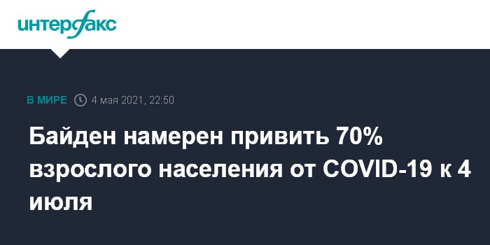Москва. 4 мая. INTERFAX.RU - США в рамках вакцинации против коронавируса поставили перед собой новую цель - привить, пусть даже одной дозой вакцины, 70% взрослых жителей страны ко Дню независимости 4 июля, заявил во вторник американский президент Джо Байден.