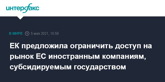 Москва. 5 мая. INTERFAX.RU - Европейская комиссия предложила регламент, который ограничит доступ на единый рынок ЕС иностранных компаний, субсидируемых государством.