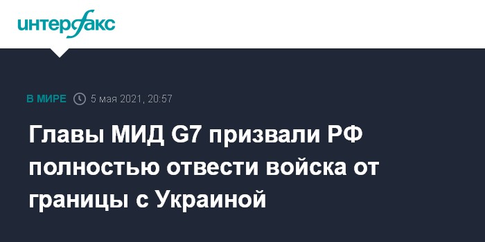 Москва. 5 мая. INTERFAX.RU - России следует отвести от границ с Украиной все переброшенные туда войска, заявили в среду главы МИД стран "группы семи" (G7) .