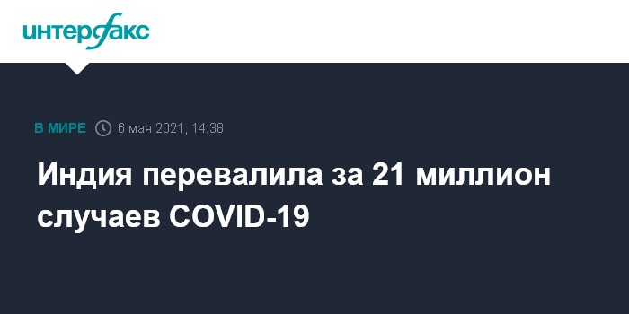 Москва. 6 мая. INTERFAX.RU - В Индии во второй раз с начала пандемии количество выявленных за сутки случаев заражения COVID-19 превысило 400 тысяч. Всего с начала пандемии в Индии подтверждено 21 077 410 случаев коронавирусной инфекции.