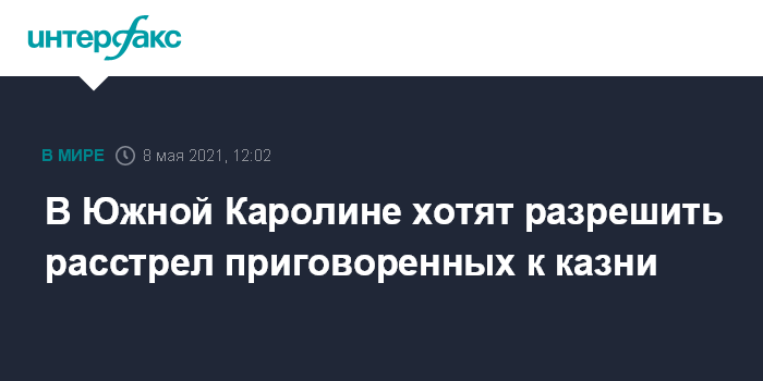 Москва. 8 мая. INTERFAX.RU - Палата представителей Южной Каролины приняла законопроект, который позволяет приводить в исполнение смертный приговор при отсутствии медикаментов для смертельной инъекции.
