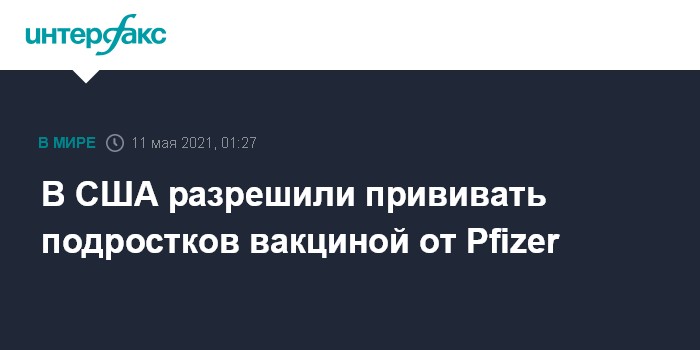 Москва. 11 мая. INTERFAX.RU - Управление по санитарному надзору за качеством пищевых продуктов и медикаментов США (FDA) в понедельник разрешило экстренное применение вакцины от коронавируса Pfizer/BioNTech для подростков 12-15 лет, сообщается на сайте регулятора.
