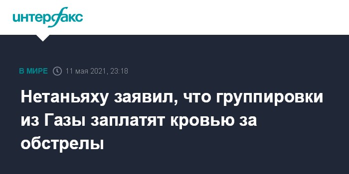 Москва. 11 мая. INTERFAX.RU - Палестинские группировки ХАМАС и "Исламский джихад" заплатят "очень большую цену" за проводимые на этой неделе ракетные обстрелы Израиля, заявил во вторник вечером израильский премьер-министр Биньямин Нетаньяху. Его слова опубликовали израильские СМИ.
