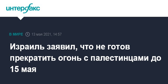 Москва. 13 мая. INTERFAX.RU - Власти Израиля заявили, что не добиваются установления режима прекращения огня с палестинцами ранее 15 мая, сообщает телеканал "Аль-Арабийя" со ссылкой на источники.